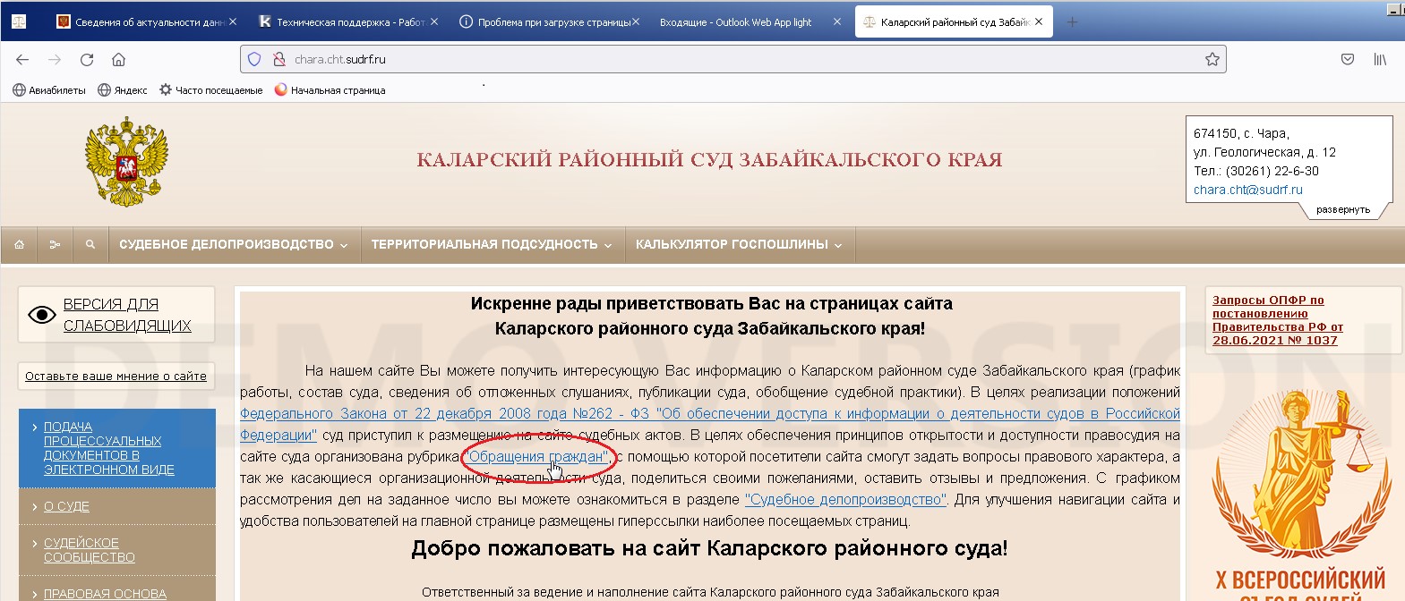 На сайте Каларского районного суда на главной странице переходим по ссылке «Обращения граждан»